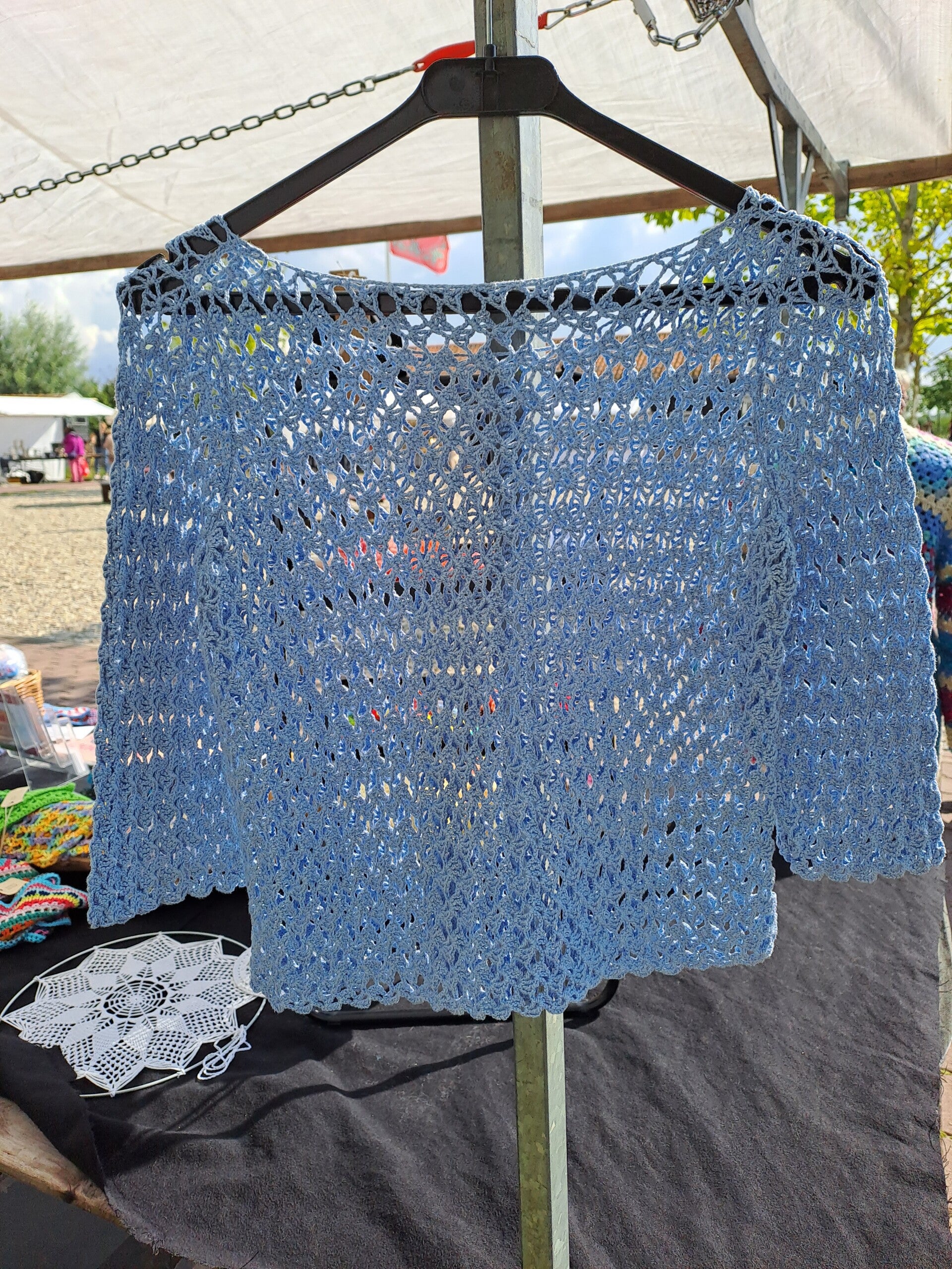 Mooie zomertrui in zacht blauw met open haak patroon. Handgemaakt dus uniek.