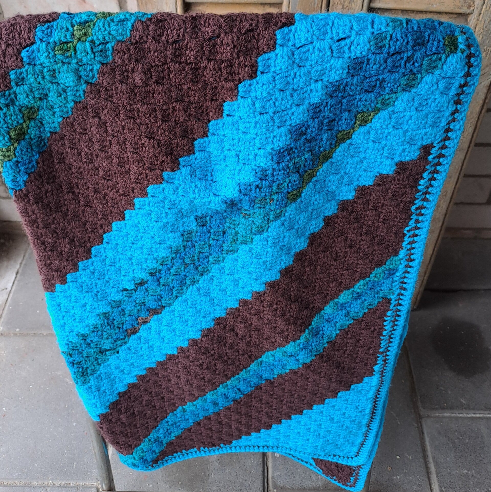 Mooi deken in bruin en turquoise handgemaakt gehaakt met 100% acryl. Past over een 1 persoonsbed. Of heerlijk op de bank, tuin en terras bij de frisse uurtjes.