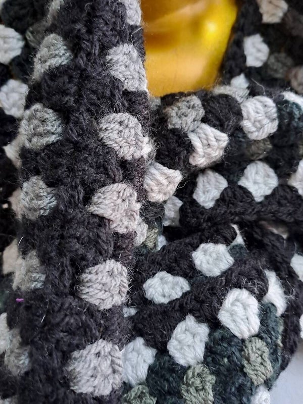 De granny sjaal is 1.80 m lang. Met bijpassende muts in donkergrijs.