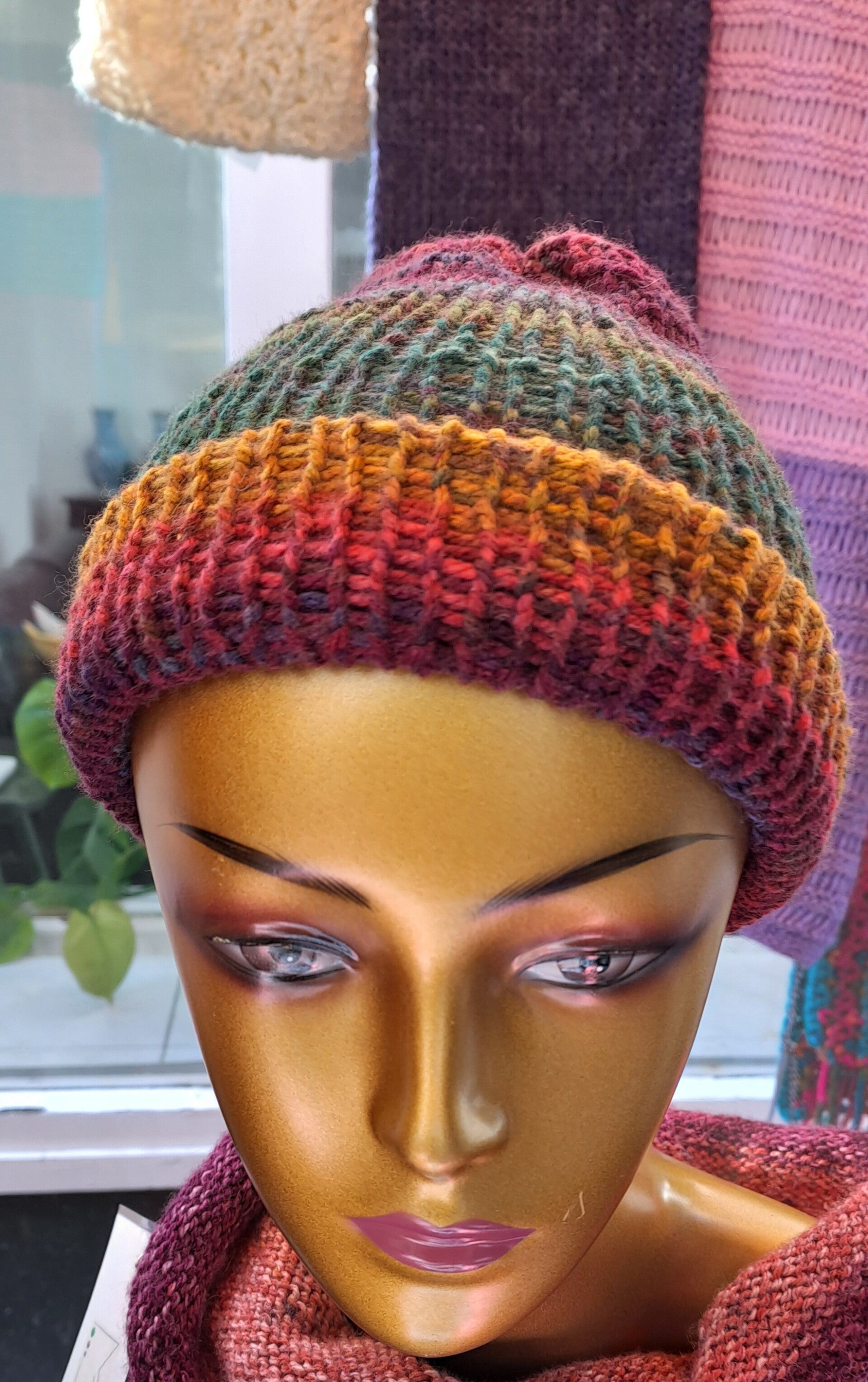 Warme muts gebreid met gemêleerd acrylgaren. De muts is dubbel gebreid dus extra warm.