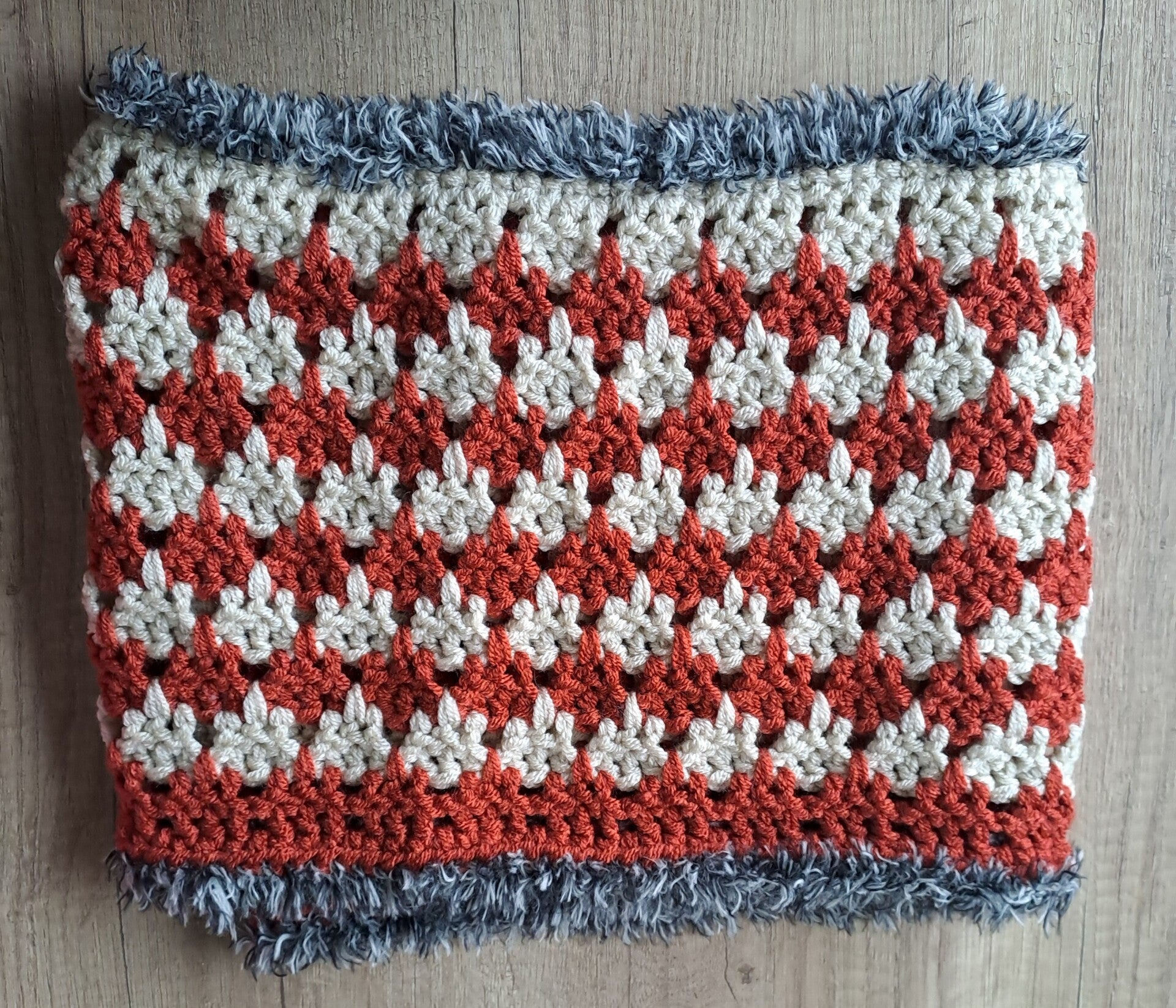Grof gehaakte donutsjaal met muts. Kan op 2 manieren gedragen worden.