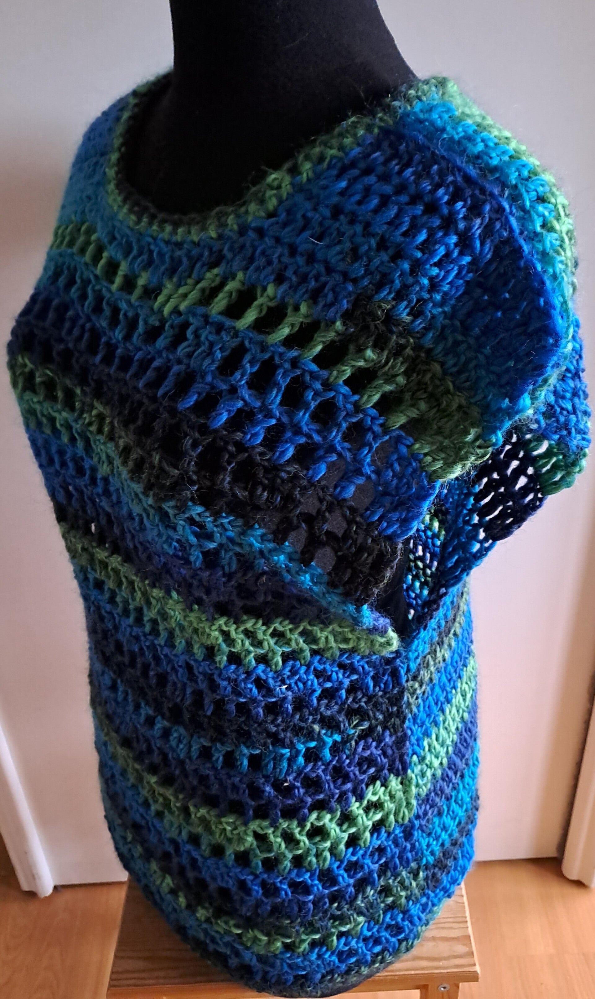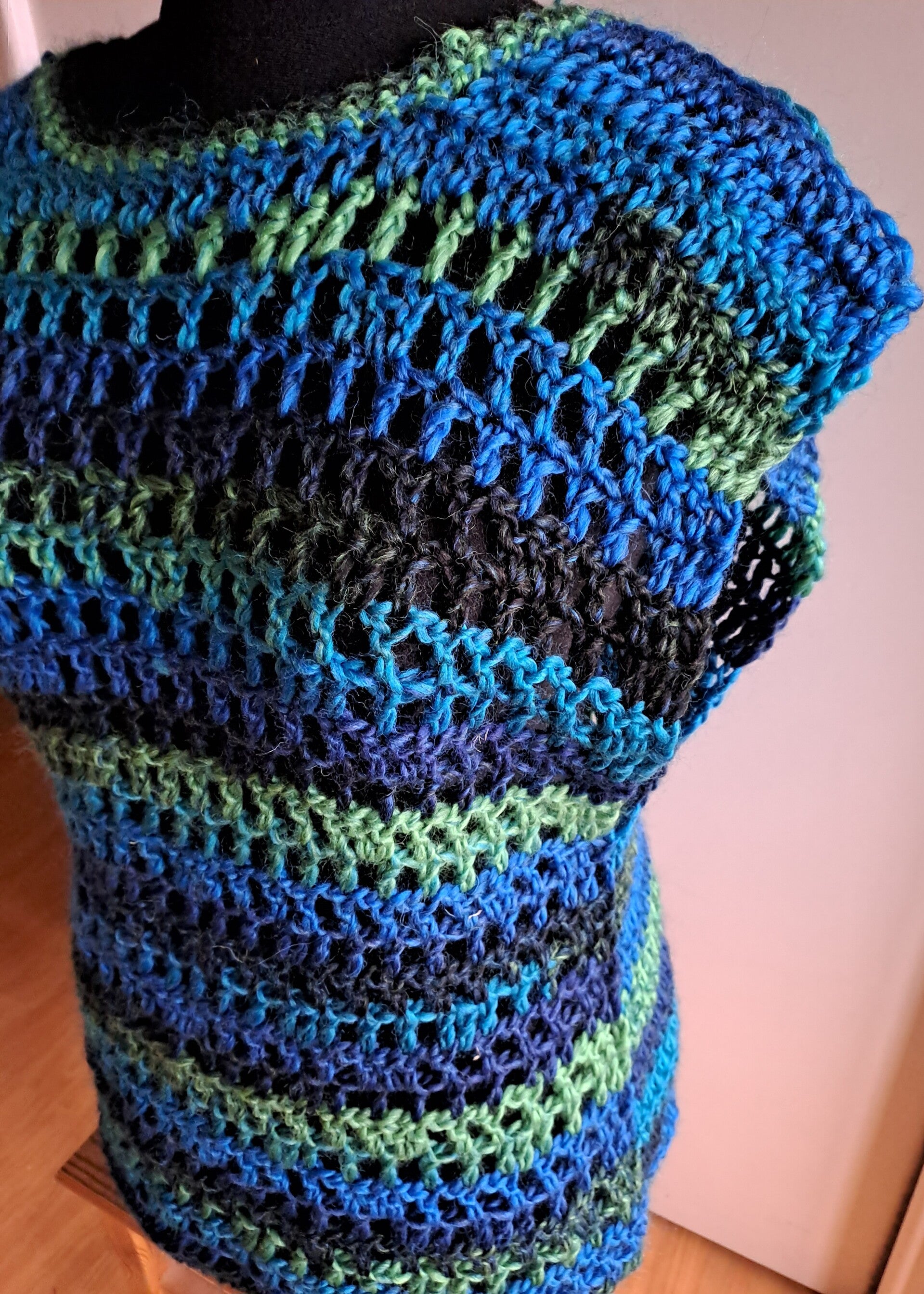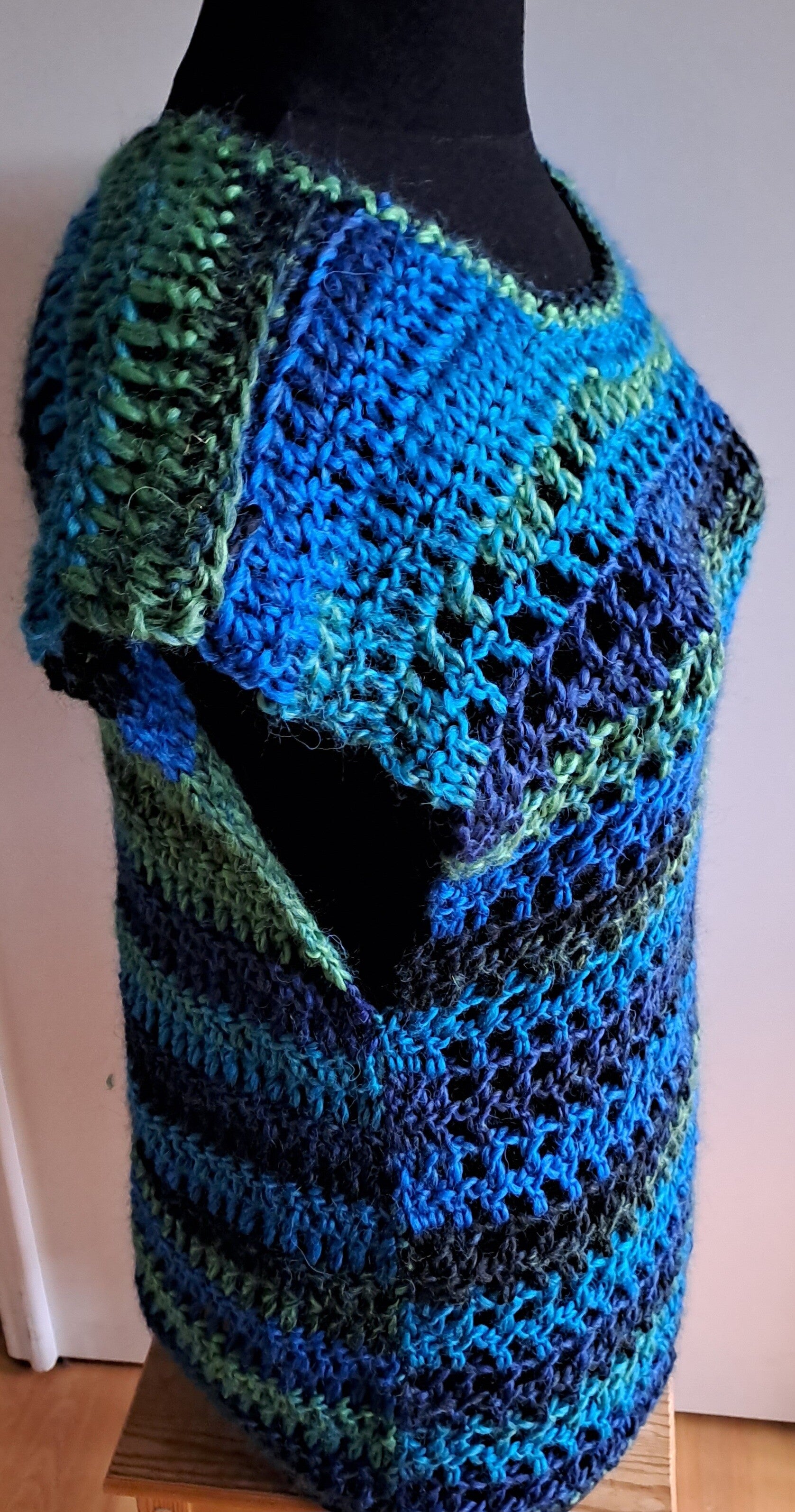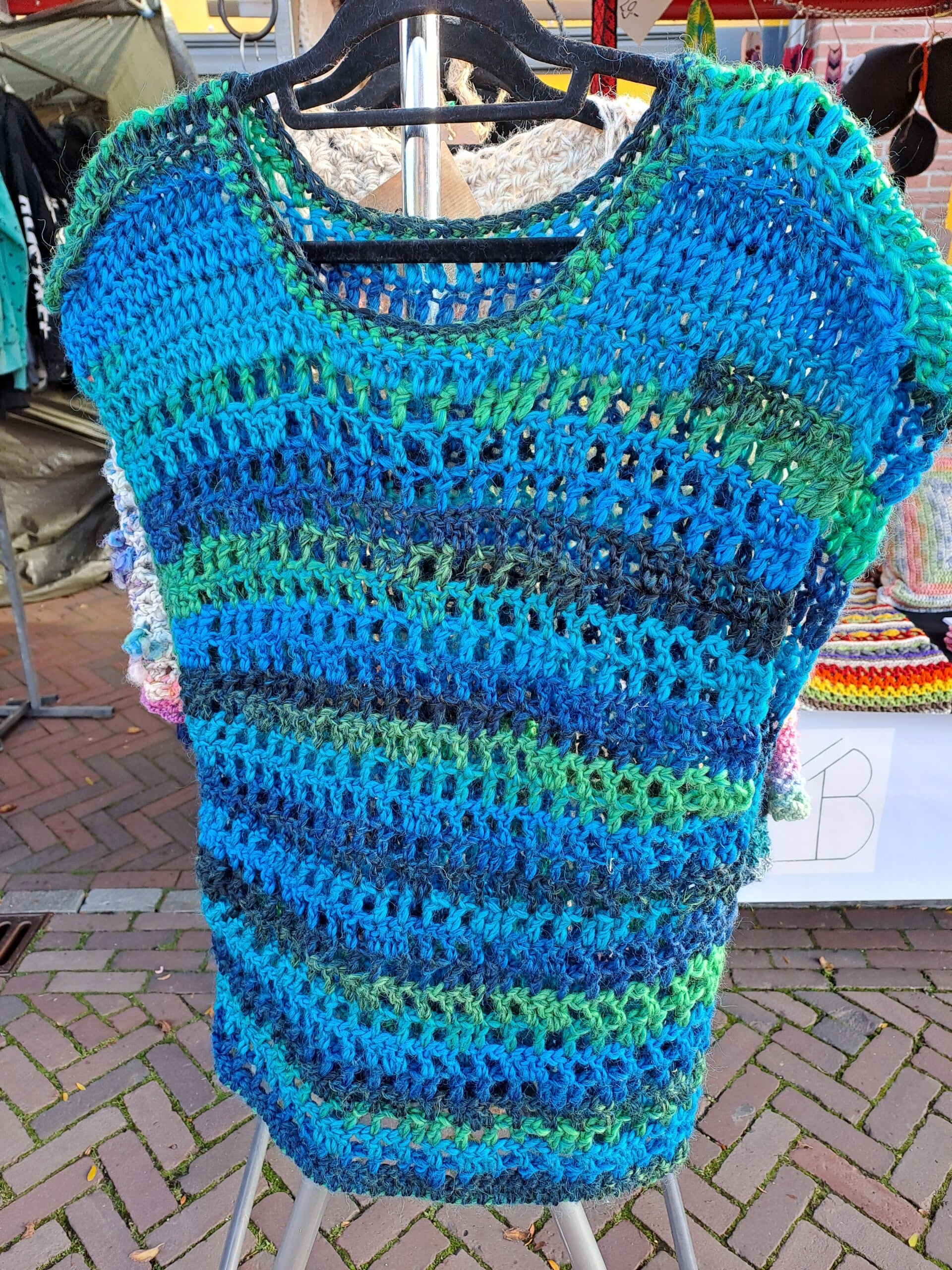 Heerlijke soepele trui zonder mouwen in blauw groentinten. Grof gehaakt met wol acrylmix garen.