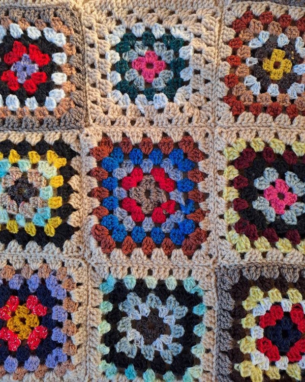 Helemaal hip zijn de granny squares. Een mooie eyecatcher in je garderobe. Handgemaakt gehaakt gilet of mouwloos vest vooral in beige. Hier en daar is er wat wol verwerkt in de blokken.
