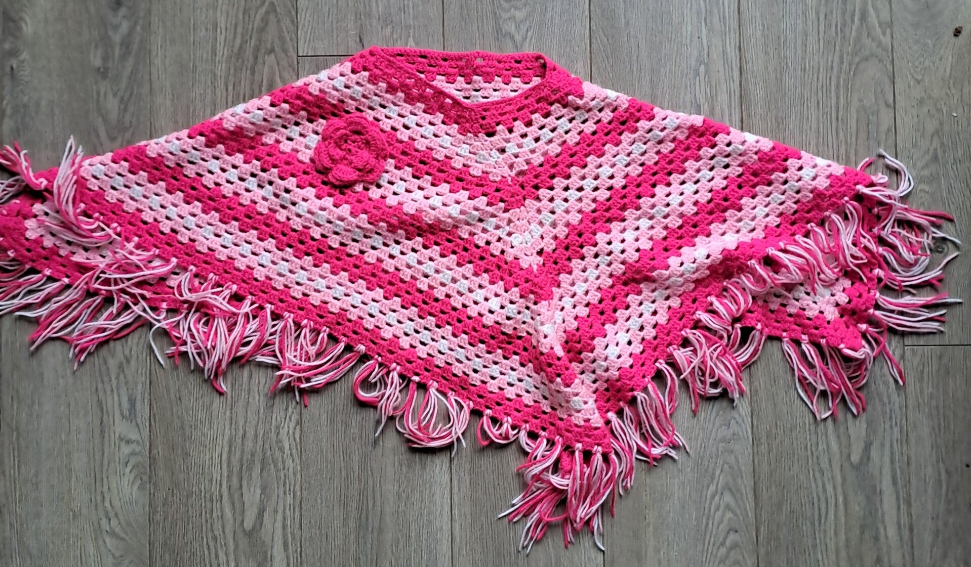 Leuke korte poncho in roze tinten. Kan ook als sjaal gedragen worden. Valt iets asymmetrisch. Met bloem.