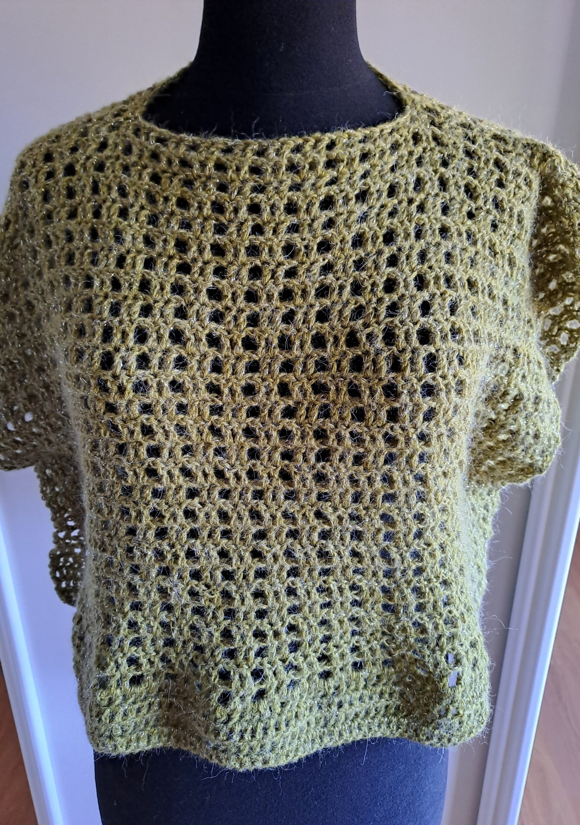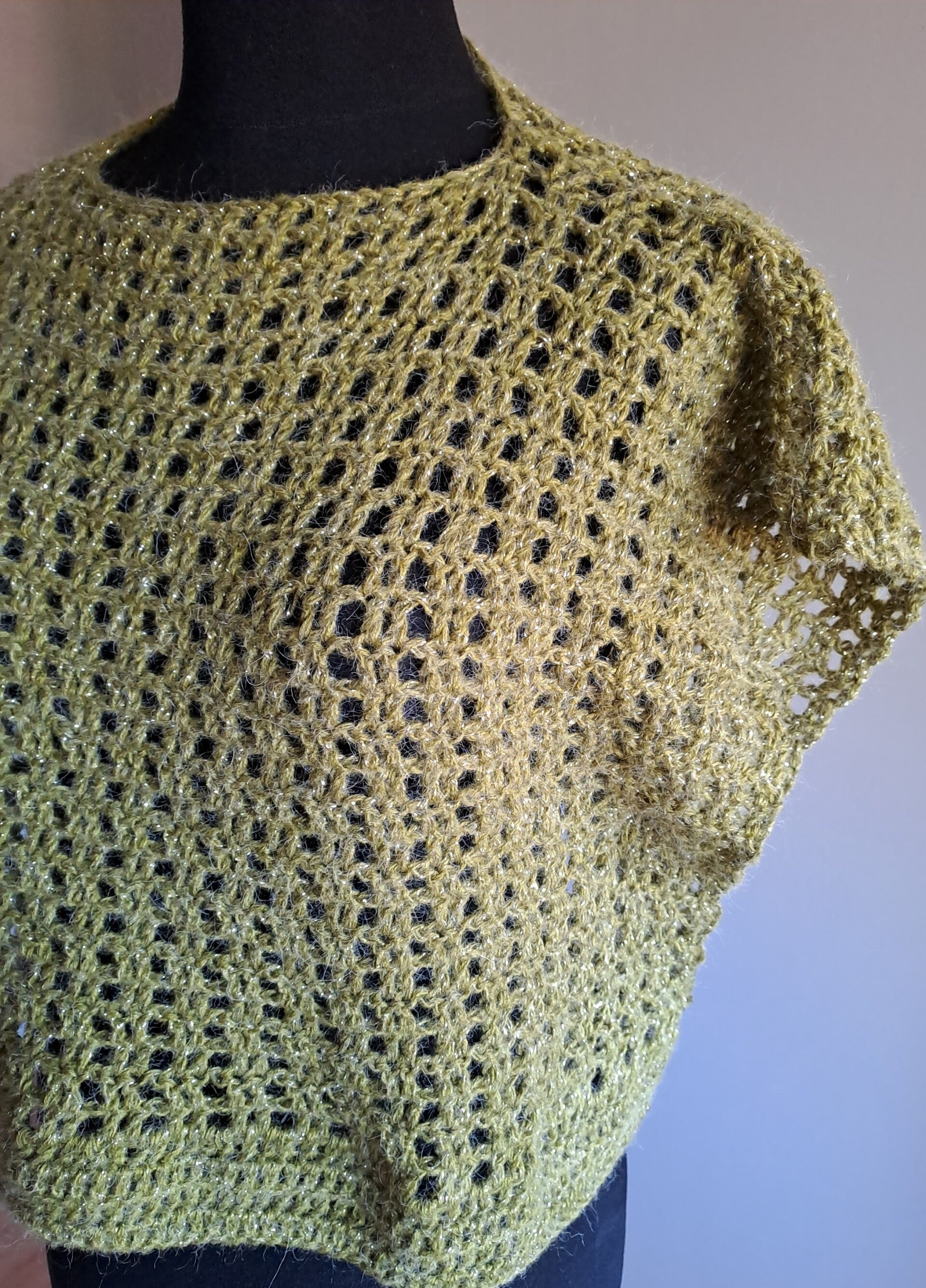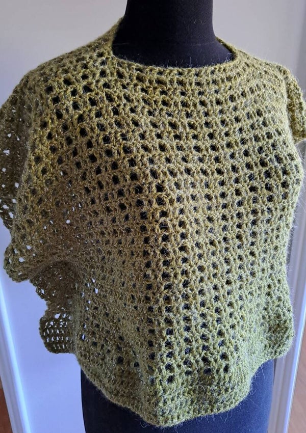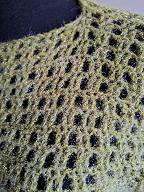 Prachtige groene wijde trui in poncho model. Met een feestelijke schittering in de wol.