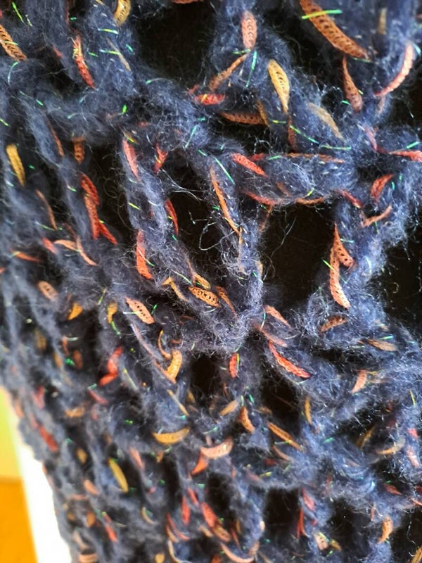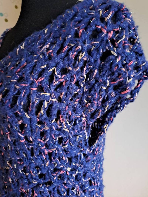 Een mooi blauw spencer met wat kleurtjes en glans in de draad. Open patroon erg soepel vallend. Een eyecatcher op een effen shirt en jeans.